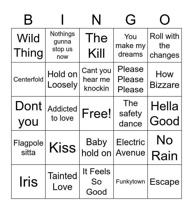 This bingo card has a free space and 35 words: Sweet Emotion, You got Lucky, Here comes the hotstepper, Hold on Loosely, Baby hold on, You make my dreams, Centerfold, Bad is bad, Cant you hear me knockin, Dirty laundry, Dont you, Roll with the changes, Danger zone, Fantastic voyage, Wild Thing, The safety dance, Funkytown, Addicted to love, Flagpole sitta, Escape, Electric Avenue, Iris, No Rain, Tainted Love, The Kill, How Bizzare, Party All the time, Everybody wants to rule the world, Please Please Please, Hella Good, Lovefool, It Feels So Good, Kiss, Nothings gunna stop us now and Fireball.