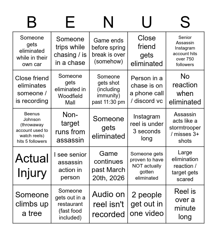 This bingo card has a free space and 24 words: I see senior assassin action in person, Someone gets out in a restaurant (fast food included), Someone gets shot (including immunity) past 11:30 pm, Someone climbs up a tree, Senior Assassin Instagram account hits over 750 followers, Someone gets eliminated while in their own car, Close friend eliminates someone / is recording, Someone trips while chasing / is in a chase, Instagram reel is under 3 seconds long, Game continues past March 20th, 2026, Person in a chase is on a phone call / discord vc, Beenus Johnson (throwaway account used to watch reels) hits 5 followers, Someone gets proven to have NOT actually gotten eliminated, Large elimination reaction / target gets scared, Someone gets eliminated in Woodfield Mall, 2 people get out in one video, Assassin acts like a stormtrooper / misses 3+ shots, Game ends before spring break is over (somehow), No reaction when eliminated, Non-target runs from assassin, Reel is over a minute long, Actual Injury, Close friend gets eliminated and Audio on reel isn't recorded.