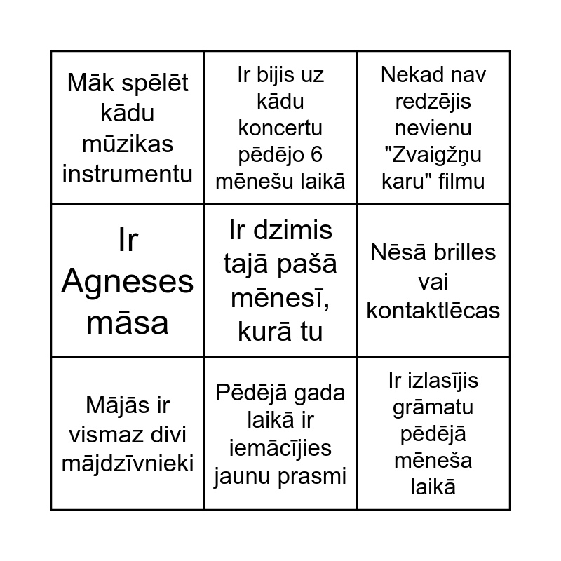 This bingo card has 57 words: Ir pazīstams ar Agnesi kopš bērnudārza/ skolas, Ir pazīstams ar Rihardu kopš bērnudārza/ skolas, Ir ceļojis vairāk nekā 300 km, lai būtu šeit, Māk spēlēt kādu mūzikas instrumentu, Runā vismaz trīs valodās, Ir laulībā vairāk nekā 5 gadus, Mājās ir vismaz divi mājdzīvnieki, Ir no tās pašas pilsētas, kur piedzimis tu pats, Ir izlasījis grāmatu pēdējā mēneša laikā, Ir Agneses māsīca, Ir Agneses māsa, Nokārtojis tiesības ar pirmo reizi, Ir pabijis vismaz 10 dažādas valstis, Šodien izdzēra vismaz 2 kafijas krūzes, Prot pagatavot biešu zupu, Ir tāds pats apavu izmērs kā tev (___), Ir dzimis tajā pašā mēnesī, kurā tu, Strādā tajā pašā nozarē vai profesijā, kurā tu, Ir veģetārietis vai vegāns, Ir domājis skriet maratonā, Šobrīd nēsā kaut ko zilu, Ir jaunāks par Rihardu, Atbrauca ar pelēku automašīnu, Nekad nav redzējis nevienu "Zvaigžņu karu" filmu, Ir suņa/ kaķa saimnieks, Pēdējā gada laikā ir iemācījies jaunu prasmi, Ir gājis dejošanas nodarbībās, Ir mācījies vienā klasē ar Agnesi, Prot pateikt "Es tevi mīlu" piecās valodās, Ir vecākais bērns savā ģimenē, Ir mācījies ārzemēs, Ir izceļojis ārpus Latvijas 2026, Prot dejot tautas dejas vai valsi, Ir šajā pasākuma uzņēmis vismaz 5 bildes, Nav dzēris nevienu alkoholisku dzērienu šovakar, Nēsā brilles vai kontaktlēcas, Ir kādreiz dziedājis korī, Prot uztaisīt "tiltiņu" vai špagatu, Ir noskatījies vismaz 3 seriālus pēdējā pusgada laikā, Viņa uzvārdā ir vismaz 8 burti, Ir bijis uz kādu koncertu pēdējo 6 mēnešu laikā, Ir bijis uz teātra izrādi pēdējo 6 mēnešu laikā, Apmeklējis zāli pēdējās nedēļas laikā, Ir vismaz par 10 gadiem vecāks par Rihardu, Ir redzējis visas "Harija Potera" filmas, Šovakar ir uzvilcis kaut ko pilnīgi jaunu (pirmo reizi mugurā), Ir lielāks telefona akumulatora uzlādes līmenis nekā tev, Ir kādreiz dzīvē uzstājies uz skatuves, Ir piedalījies Dziesmu un deju svētkos, Ir vārdā ir vismaz 3 patskaņi (piem. A, E, I, O, U), Prot pagatavot vismaz 3 dažādus kokteiļus, Ir redzējis "Limuzīns Jāņu nakts krāsā", Ir bijis uz kāzām ārzemēs, Ir ieguvis bakalaura grādu, Kādu kam mājās ir glezna, Ir kādreiz mūžā piedalījies kādā televīzijas raidījumā vai intervijā and Ir vismaz 2 Apple produkta īpašnieks.