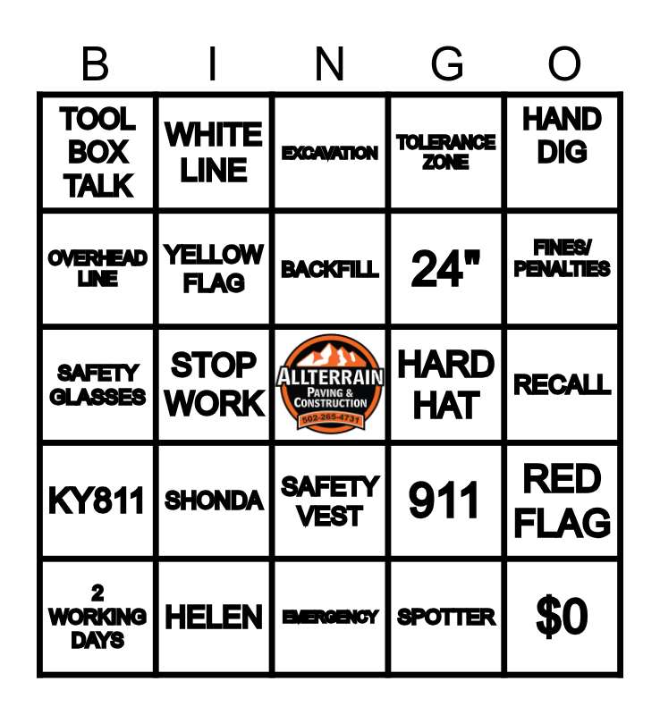 This bingo card has a free space and 24 words: SHONDA, HELEN, BACKFILL, 2 WORKING DAYS, HAND DIG, TOOL BOX TALK, OVERHEAD LINE, WHITE LINE, HARD HAT, SAFETY VEST, 24", SAFETY GLASSES, 911, RED FLAG, YELLOW FLAG, SPOTTER, RECALL, EXCAVATION, FINES/ PENALTIES, STOP WORK, $0, KY811, TOLERANCE ZONE and EMERGENCY.