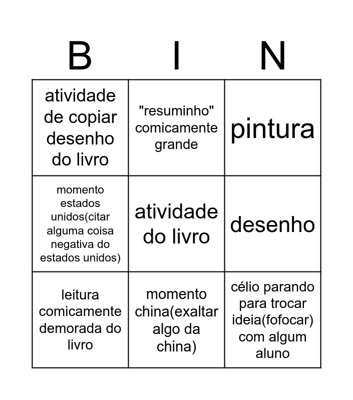This bingo card has a free space and 8 words: desenho, pintura, "resuminho" comicamente grande, leitura comicamente demorada do livro, atividade de copiar desenho do livro, célio parando para trocar ideia(fofocar) com algum aluno, momento estados unidos(citar alguma coisa negativa do estados unidos) and momento china(exaltar algo da china).