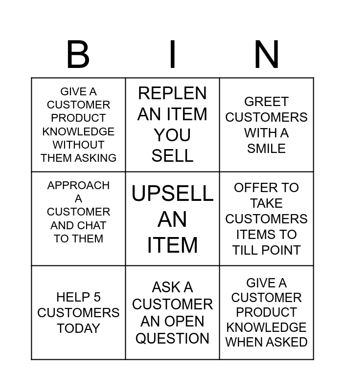 This bingo card has 9 words: HELP 5 CUSTOMERS TODAY, GREET CUSTOMERS WITH A SMILE, REPLEN AN ITEM YOU SELL, APPROACH A CUSTOMER AND CHAT TO THEM, GIVE A CUSTOMER PRODUCT KNOWLEDGE WITHOUT THEM ASKING, OFFER TO TAKE CUSTOMERS ITEMS TO TILL POINT, UPSELL AN ITEM, GIVE A CUSTOMER PRODUCT KNOWLEDGE WHEN ASKED and ASK A CUSTOMER AN OPEN QUESTION.