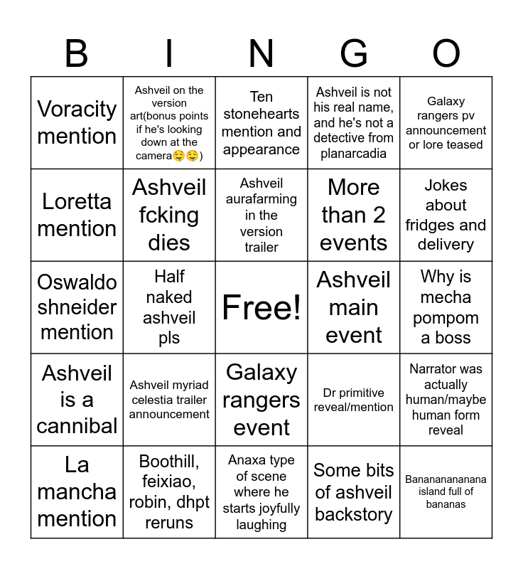 This bingo card has a free space and 24 words: Ashveil myriad celestia trailer announcement, Boothill, feixiao, robin, dhpt reruns, Ashveil aurafarming in the version trailer, La mancha mention, Galaxy rangers pv announcement or lore teased, Voracity mention, Loretta mention, Ashveil on the version art(bonus points if he's looking down at the camera🤤🤤), Ashveil main event, Galaxy rangers event, More than 2 events, Oswaldo shneider mention, Dr primitive reveal/mention, Narrator was actually human/maybe human form reveal, Ashveil fcking dies, Some bits of ashveil backstory, Why is mecha pompom a boss, Ten stonehearts mention and appearance, Jokes about fridges and delivery, Half naked ashveil pls, Banananananana island full of bananas, Ashveil is a cannibal, Ashveil is not his real name, and he's not a detective from planarcadia and Anaxa type of scene where he starts joyfully laughing.