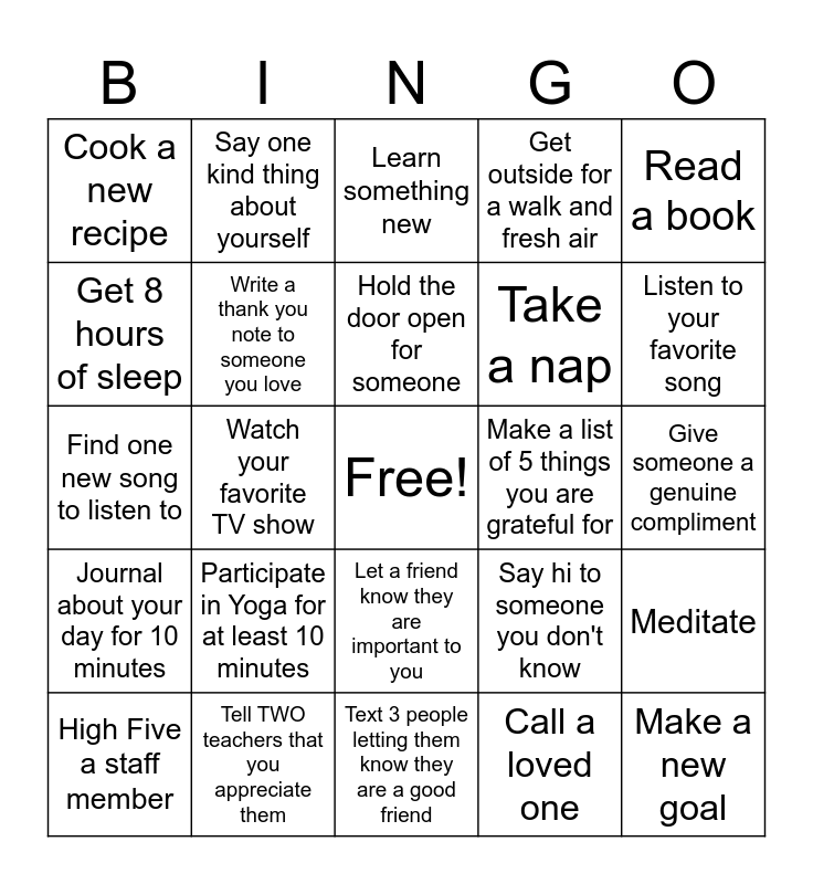 This bingo card has a free space and 24 words: Participate in Yoga for at least 10 minutes, Tell TWO teachers that you appreciate them, Hold the door open for someone, High Five a staff member, Read a book, Cook a new recipe, Get 8 hours of sleep, Say one kind thing about yourself, Make a list of 5 things you are grateful for, Let a friend know they are important to you, Take a nap, Find one new song to listen to, Say hi to someone you don't know, Meditate, Write a thank you note to someone you love, Call a loved one, Give someone a genuine compliment, Learn something new, Listen to your favorite song, Watch your favorite TV show, Make a new goal, Journal about your day for 10 minutes, Get outside for a walk and fresh air and Text 3 people letting them know they are a good friend.