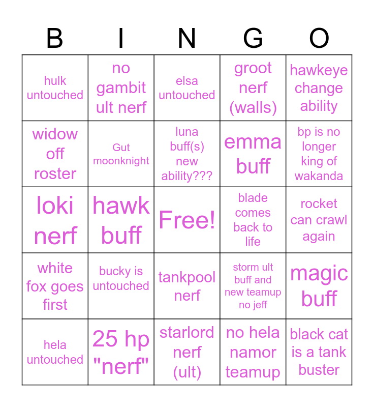 This bingo card has a free space and 24 words: bucky is untouched, 25 hp "nerf", luna buff(s) new ability???, hela untouched, hawkeye change ability, hulk untouched, widow off roster, no gambit ult nerf, blade comes back to life, tankpool nerf, emma buff, loki nerf, storm ult buff and new teamup no jeff, magic buff, Gut moonknight, no hela namor teamup, rocket can crawl again, elsa untouched, bp is no longer king of wakanda, hawk buff, black cat is a tank buster, white fox goes first, groot nerf (walls) and starlord nerf (ult).