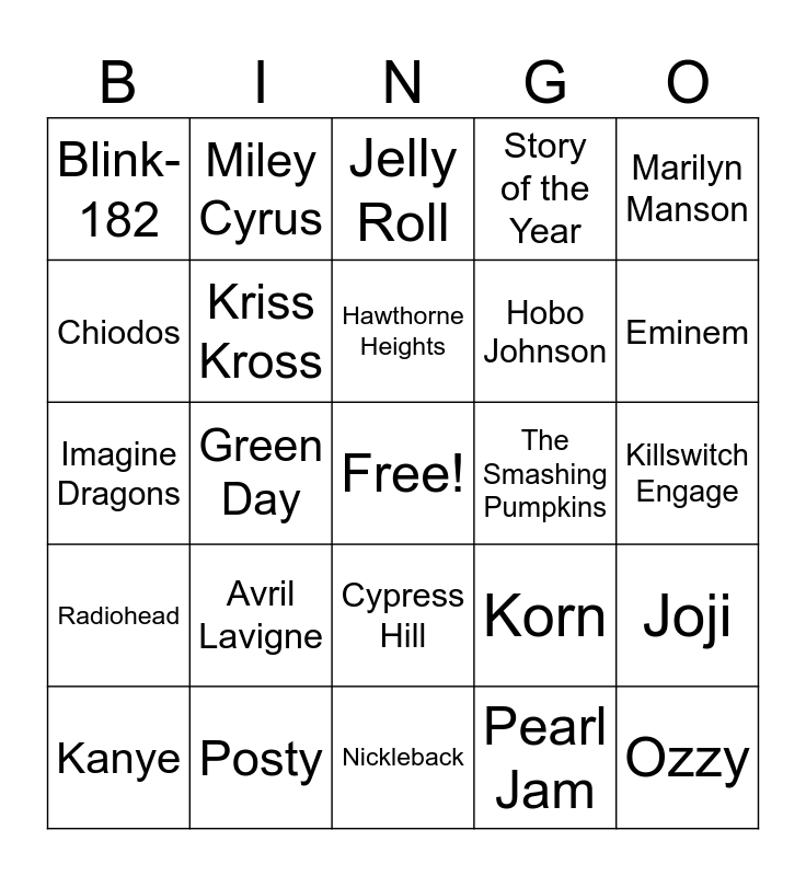 This bingo card has a free space and 35 words: Owl City, TLC, Crazy Town, Kriss Kross, Cypress Hill, Story of the Year, Chiodos, Falling In Reverse, Hawthorne Heights, The Used, Imagine Dragons, Marilyn Manson, Taylor Swift, Rob Zombie, Blink-182, The Smashing Pumpkins, Pearl Jam, Green Day, Radiohead, Ozzy, Korn, Kanye, Joji, Posty, Jelly Roll, Eminem, Tyler, The Creator, Deftones, Hobo Johnson, Killswitch Engage, Creed, Nickleback, Avril Lavigne, Miley Cyrus and A Day To Remember.