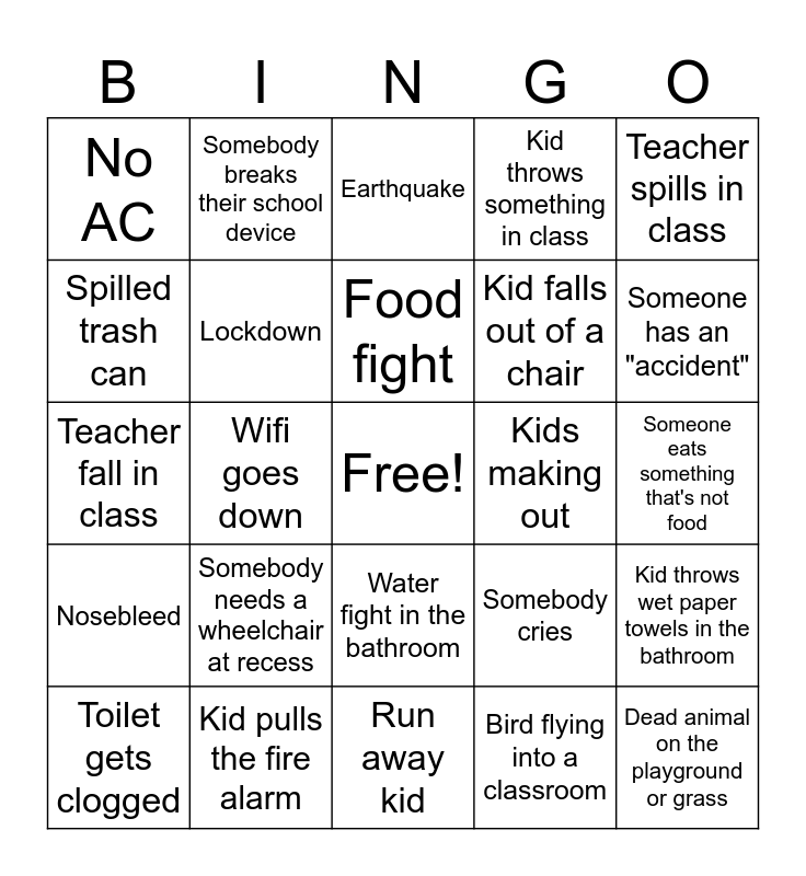 This bingo card has a free space and 30 words: Kid pulls the fire alarm, Aeries goes down, Wifi goes down, Blackout, No AC, Earthquake, Lockdown, Water fight in the bathroom, Kids making out, Run away kid, Someone eats something that's not food, Dead animal on the playground or grass, Bird flying into a classroom, Lizard in the classroom, Someone has an "accident", Somebody throws up, Somebody cries, Nosebleed, Somebody needs a wheelchair at recess, Teacher spills in class, Teacher fall in class, Kid spills in class, Somebody breaks their school device, Kid falls out of a chair, Spilled trash can, Kid throws something in class, Kid throws wet paper towels in the bathroom, Toilet gets clogged, Food fight and Sub doesn't show up.