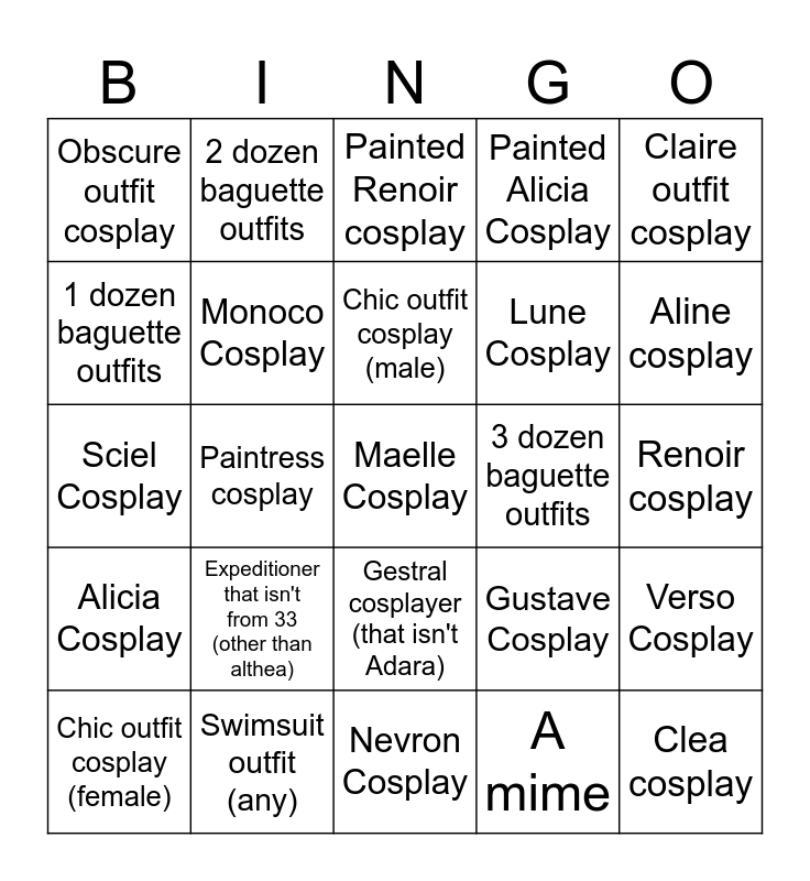 This bingo card has a free space and 24 words: Expeditioner that isn't from 33 (other than althea), Swimsuit outfit (any), Chic outfit cosplay (male), Chic outfit cosplay (female), Claire outfit cosplay, Obscure outfit cosplay, 1 dozen baguette outfits, 2 dozen baguette outfits, 3 dozen baguette outfits, Gestral cosplayer (that isn't Adara), Lune Cosplay, Sciel Cosplay, Gustave Cosplay, Verso Cosplay, Monoco Cosplay, A mime, Renoir cosplay, Painted Renoir cosplay, Aline cosplay, Paintress cosplay, Clea cosplay, Alicia Cosplay, Painted Alicia Cosplay and Nevron Cosplay.