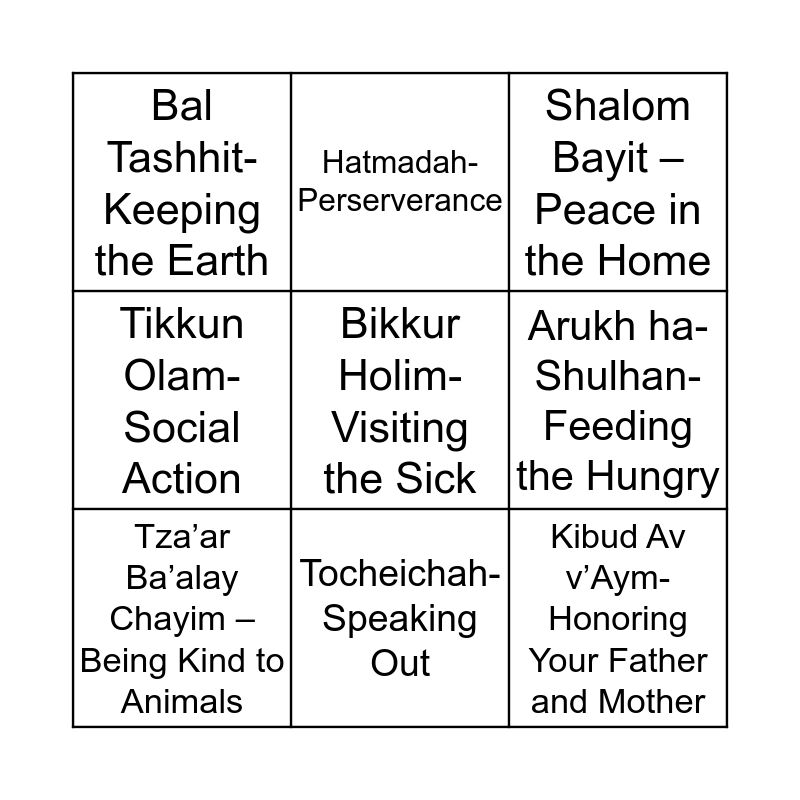 This bingo card has a free space and 8 words: Arukh ha-Shulhan-Feeding the Hungry, Shalom Bayit – Peace in the Home, Hatmadah-Perserverance, Tza’ar Ba’alay Chayim – Being Kind to Animals, Bal Tashhit-Keeping the Earth, Kibud Av v’Aym- Honoring Your Father and Mother, Tikkun Olam- Social Action and Tocheichah-Speaking Out.