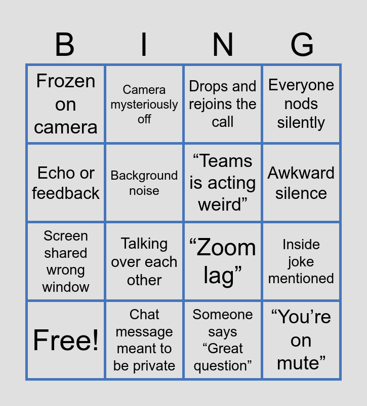 This bingo card has 23 words: “You’re on mute”, Can everyone see my screen?, Awkward silence, Someone joins late, Echo or feedback, Frozen on camera, Background noise, Camera mysteriously off, Free!, “Sorry, my internet is unstable”, Talking over each other, Screen shared wrong window, “I can’t hear you”, Accidentally unmutes, Chat message meant to be private, Virtual background glitch, Drops and rejoins the call, “Zoom lag”, “Teams is acting weird”, Inside joke mentioned, Everyone nods silently, Someone says “Great question” and Someone forgets what day it is.