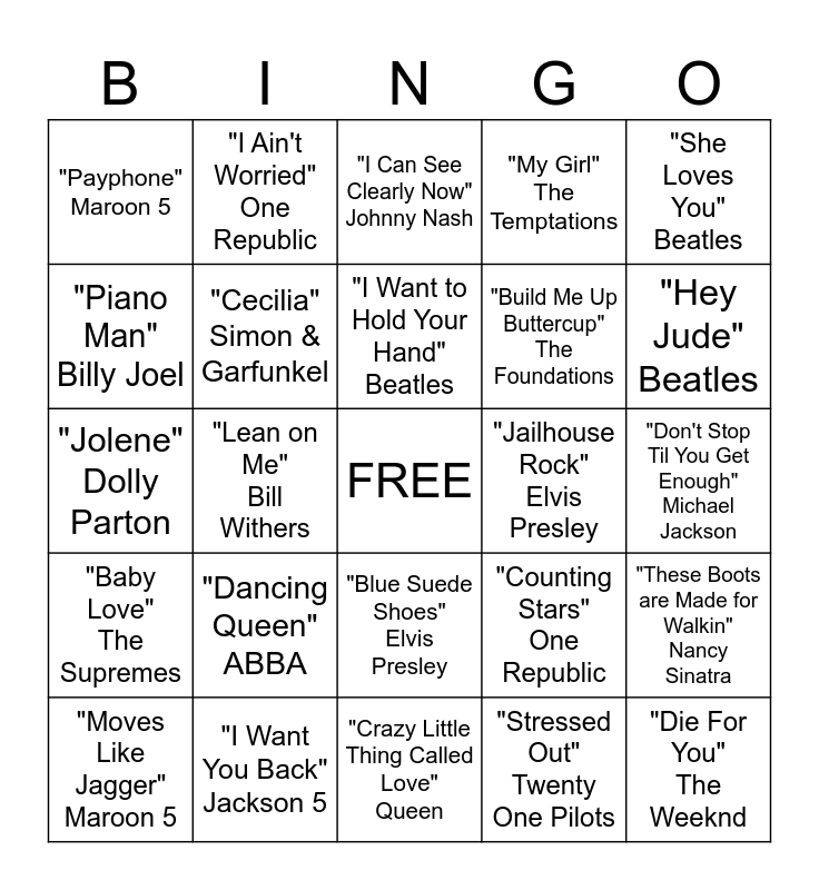 This bingo card has a free space and 24 words: "Dancing Queen" ABBA, "I Want You Back" Jackson 5, "I Want to Hold Your Hand" Beatles, "Moves Like Jagger" Maroon 5, "She Loves You" Beatles, "Payphone" Maroon 5, "Piano Man" Billy Joel, "I Ain't Worried" One Republic, "Jailhouse Rock" Elvis Presley, "Blue Suede Shoes" Elvis Presley, "Build Me Up Buttercup" The Foundations, "Jolene" Dolly Parton, "Counting Stars" One Republic, "These Boots are Made for Walkin" Nancy Sinatra, "Cecilia" Simon & Garfunkel, "Stressed Out" Twenty One Pilots, "Don't Stop Til You Get Enough" Michael Jackson, "I Can See Clearly Now" Johnny Nash, "Hey Jude" Beatles, "Lean on Me" Bill Withers, "Die For You" The Weeknd, "Baby Love" The Supremes, "My Girl" The Temptations and "Crazy Little Thing Called Love" Queen.