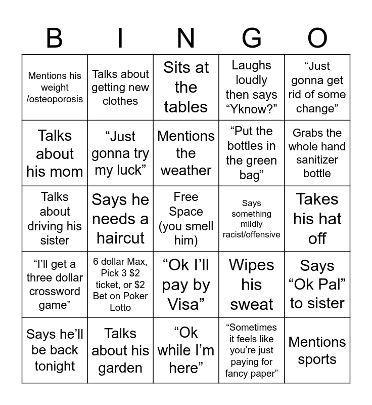 This bingo card has a free space and 26 words: “Ok I’ll pay by Visa”, “Sometimes it feels like you’re just paying for fancy paper”, Mentions the weather, Talks about his garden, “Just gonna get rid of some change”, Mentions his weight /osteoporosis, Talks about his mom, Talks about getting new clothes, Takes his hat off, Wipes his sweat, “Put the bottles in the green bag”, Talks about driving his sister, Says “Ok Pal” to sister, Says he’ll be back tonight, Says he needs a haircut, Mentions his dad, Laughs loudly then says “Yknow?”, “I’ll get a three dollar crossword game”, Sits at the tables, Mentions sports, Grabs the whole hand sanitizer bottle, “Ok while I’m here”, Says something mildly racist/offensive, 6 dollar Max, Pick 3 $2 ticket, or $2 Bet on Poker Lotto, “Just gonna try my luck” and Ok I’ll get the cash.