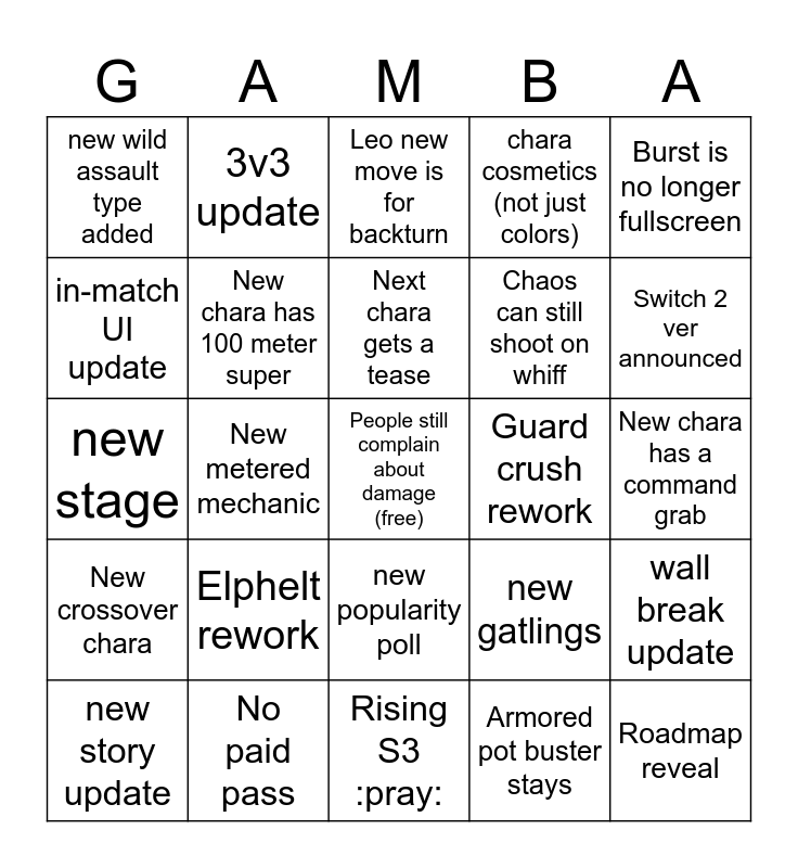 This bingo card has a free space and 24 words: Elphelt rework, No paid pass, Next chara gets a tease, new story update, Burst is no longer fullscreen, new wild assault type added, in-match UI update, 3v3 update, Guard crush rework, new popularity poll, Chaos can still shoot on whiff, new stage, new gatlings, wall break update, New chara has 100 meter super, Armored pot buster stays, New chara has a command grab, Leo new move is for backturn, Switch 2 ver announced, New metered mechanic, Roadmap reveal, New crossover chara, chara cosmetics (not just colors) and Rising S3 :pray:.