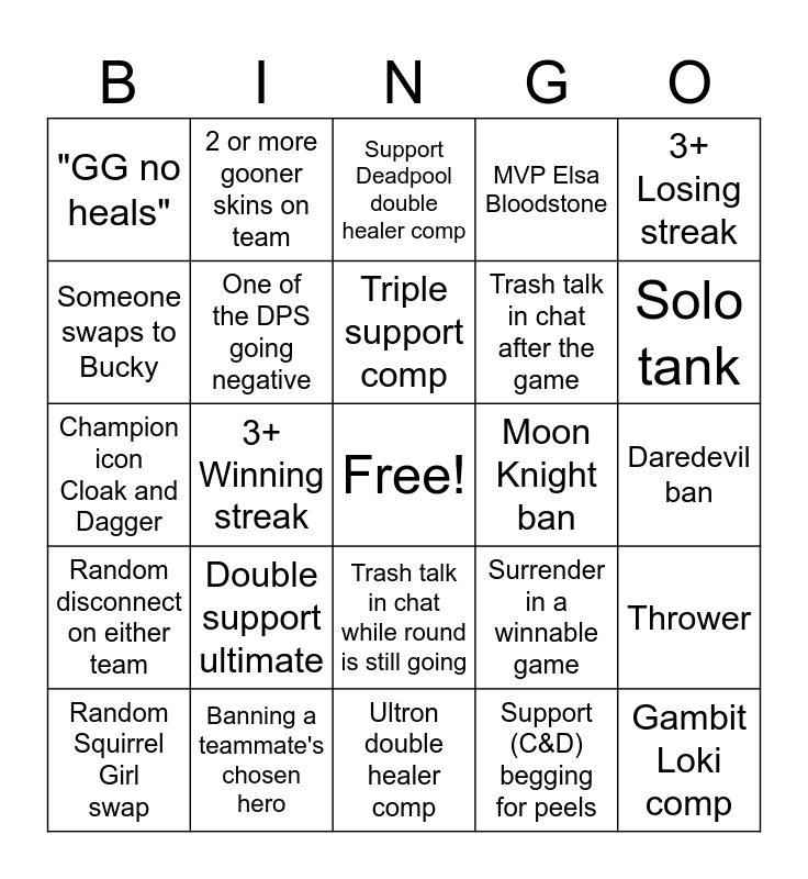 This bingo card has a free space and 24 words: Double support ultimate, Banning a teammate's chosen hero, Triple support comp, Random Squirrel Girl swap, 3+ Losing streak, "GG no heals", Someone swaps to Bucky, 2 or more gooner skins on team, Moon Knight ban, Trash talk in chat while round is still going, Trash talk in chat after the game, Champion icon Cloak and Dagger, Surrender in a winnable game, Thrower, One of the DPS going negative, Support (C&D) begging for peels, Daredevil ban, Support Deadpool double healer comp, Solo tank, 3+ Winning streak, Gambit Loki comp, Random disconnect on either team, MVP Elsa Bloodstone and Ultron double healer comp.