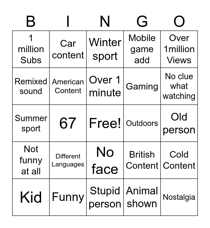 This bingo card has a free space and 24 words: Kid, Different Languages, Over 1 minute, Animal shown, Over 1million Views, 1 million Subs, Car content, Winter sport, Outdoors, Old person, Summer sport, American Content, British Content, Cold Content, Remixed sound, Funny, Stupid person, Mobile game add, No clue what watching, Not funny at all, 67, No face, Gaming and Nostalgia.