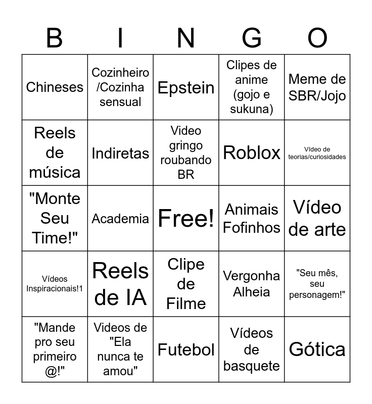 This bingo card has a free space and 24 words: Reels de IA, Videos de "Ela nunca te amou", Video gringo roubando BR, "Mande pro seu primeiro @!", Meme de SBR/Jojo, Chineses, Reels de música, Cozinheiro /Cozinha sensual, Animais Fofinhos, Clipe de Filme, Roblox, "Monte Seu Time!", Vergonha Alheia, "Seu mês, seu personagem!", Indiretas, Vídeos de basquete, Vídeo de arte, Epstein, Vídeo de teorias/curiosidades, Academia, Gótica, Vídeos Inspiracionais!1, Clipes de anime (gojo e sukuna) and Futebol.