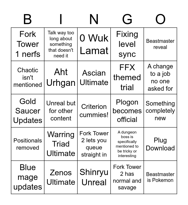 This bingo card has a free space and 24 words: Warring Triad Ultimate, Zenos Ultimate, Ascian Ultimate, Blue mage updates, Beastmaster reveal, Fork Tower 1 nerfs, Chaotic isn't mentioned, Talk way too long about something that doesn't need it, Plogon becomes official, Fork Tower 2 lets you queue straight in, FFX themed trial, Gold Saucer Updates, A dungeon boss is specifically mentioned to be tricky or interesting, Plug Download, Aht Urhgan, Fork Tower 2 has normal and savage, Something completely new, 0 Wuk Lamat, A change to a job no one asked for, Unreal but for other content, Beastmaster is Pokemon, Positionals removed, Fixing level sync and Shinryu Unreal.