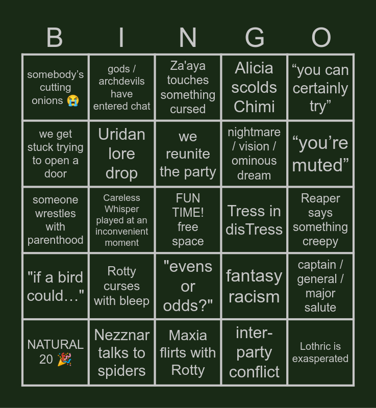 This bingo card has a free space and 29 words: NATURAL 20 🎉, critical fail 💀, Careless Whisper played at an inconvenient moment, roll initiative, somebody’s cutting onions 😭, Za'aya touches something cursed, Uridan lore drop, Rotty curses with bleep, Tress in disTress, Nezznar talks to spiders, Reaper says something creepy, Lothric is exasperated, Maxia flirts with Rotty, inter-party conflict, “you’re muted”, “this session is brought to you by…”, "evens or odds?", "if a bird could…", “you can certainly try”, someone wrestles with parenthood, fantasy racism, halfling luck, nightmare / vision / ominous dream, we get stuck trying to open a door, Alicia scolds Chimi, gods / archdevils have entered chat, captain / general / major salute, we reunite the party and someone falls unconscious.