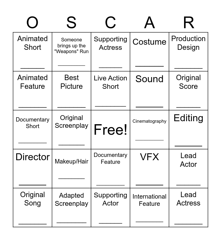 This bingo card has a free space and 24 words: Makeup/Hair ________, Adapted Screenplay ________, Live Action Short ________, Original Song _______, Production Design _______, Animated Short ______, Animated Feature _______, Someone brings up the "Weapons" Run __________, Cinematography ___________, Documentary Feature _________, Sound _____, Documentary Short _________, VFX _____, Lead Actor ______, Best Picture _______, International Feature ________, Editing _____, Supporting Actress ______, Original Score ______, Original Screenplay _______, Lead Actress _______, Director _____, Costume ______ and Supporting Actor ______.