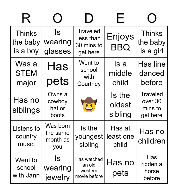 This bingo card has a free space and 24 words: Was born the same month as you, Is wearing jewelry, Went to school with Courtney, Went to school with Jann, Thinks the baby is a girl, Thinks the baby is a boy, Was a STEM major, Is wearing glasses, Is the oldest sibling, Is the youngest sibling, Is a middle child, Has no siblings, Has at least one child, Has no children, Has pets, Has no pets, Traveled over 30 mins to get here, Traveled less than 30 mins to get here, Has line danced before, Owns a cowboy hat or boots, Has ridden a horse before, Listens to country music, Enjoys BBQ and Has watched an old western movie before.