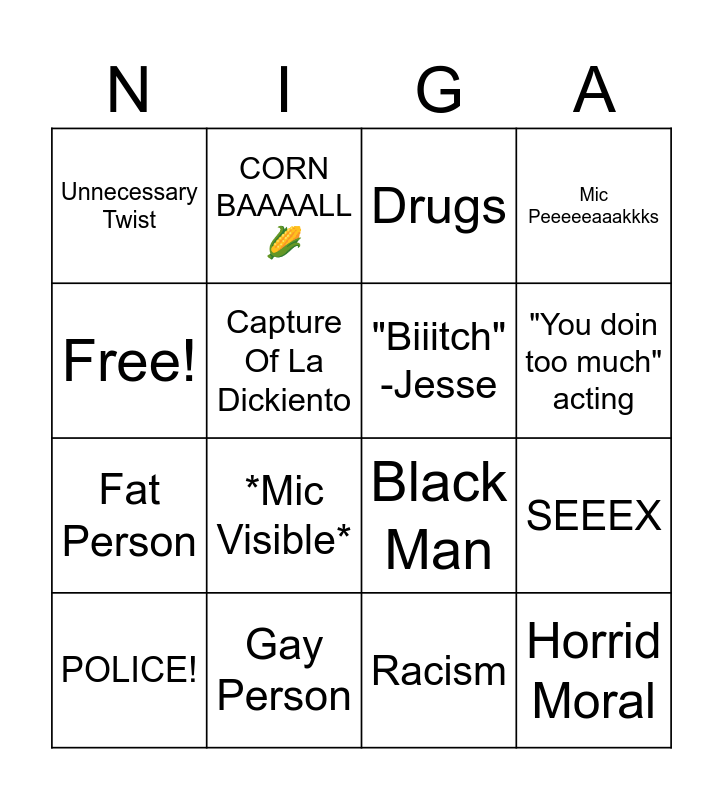 This bingo card has 16 words: Gay Person, SEEEX, Drugs, Unnecessary Twist, Fat Person, CORN BAAAALL🌽, Black Man, Racism, Free!, Capture Of La Dickiento, POLICE!, Mic Peeeeeaaakkks, *Mic Visible*, "You doin too much" acting, "Biiitch" -Jesse and Horrid Moral.