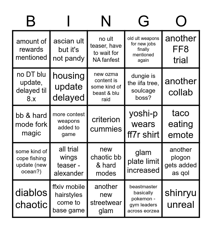 This bingo card has a free space and 24 words: all trial wings teaser - alexander, ffxiv mobile hairstyles come to base game, new ozma content is some kind of beast & blu raid, diablos chaotic, another FF8 trial, amount of rewards mentioned, no DT blu update, delayed til 8.x, ascian ult but it's not pandy, yoshi-p wears ff7r shirt, new chaotic bb & hard modes, dungie is the iifa tree, soulcage boss?, bb & hard mode fork magic, glam plate limit increased, another plogon gets added as qol, housing update delayed, beastmaster basically pokemon - gym leaders across eorzea, taco eating emote, no ult teaser, have to wait for NA fanfest, another collab, more contest weapons added to game, shinryu unreal, some kind of cope fishing update (new ocean?), old ult weapons for new jobs finally mentioned again and another new streetwear glam.