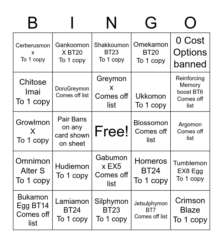 This bingo card has a free space and 24 words: Hudiemon To 1 copy, Lamiamon BT24 To 1 copy, Greymon x Comes off list, Bukamon Egg BT14 Comes off list, 0 Cost Options banned, Cerberusmon x To 1 copy, Chitose Imai To 1 copy, Gankoomon X BT20 To 1 copy, Blossomon Comes off list, Gabumon x EX5 Comes off list, Ukkomon To 1 copy, Growlmon X To 1 copy, Homeros BT24 To 1 copy, Tumblemon EX8 Egg To 1 copy, DoruGreymon Comes off list, Jetsulphymon BT7 Comes off list, Argomon Comes off list, Shakkoumon BT23 To 1 copy, Reinforcing Memory boost BT6 Comes off list, Pair Bans on any card shown on sheet, Crimson Blaze To 1 copy, Omnimon Alter S To 1 copy, Omekamon BT20 To 1 copy and Silphymon BT23 To 1 copy.