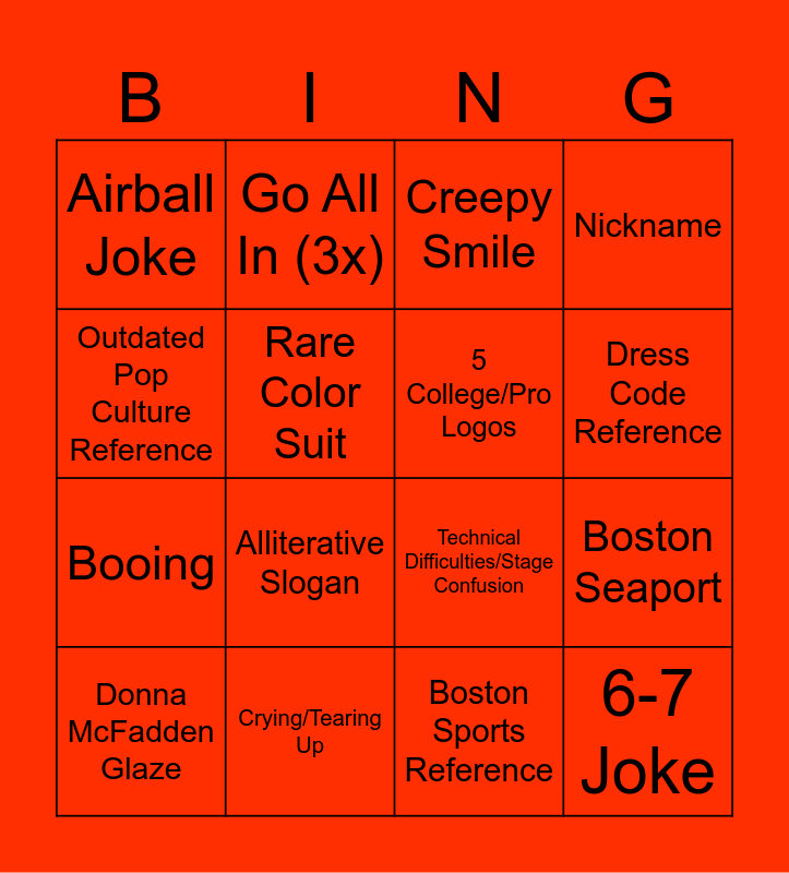 This bingo card has 16 words: Donna McFadden Glaze, Crying/Tearing Up, Creepy Smile, Nickname, Outdated Pop Culture Reference, Go All In (3x), Technical Difficulties/Stage Confusion, Boston Seaport, Airball Joke, Rare Color Suit, Boston Sports Reference, Dress Code Reference, Booing, Alliterative Slogan, 5 College/Pro Logos and 6-7 Joke.