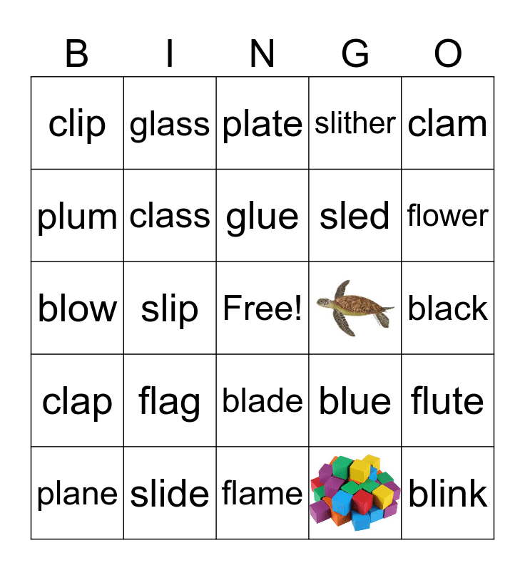 This bingo card has 2 images, a free space and 22 words: flag, slide, glue, plane, clam, clip, plum, glass, blade, sled, blow, blue, flute, class, black, plate, flower, slip, blink, clap, slither and flame.