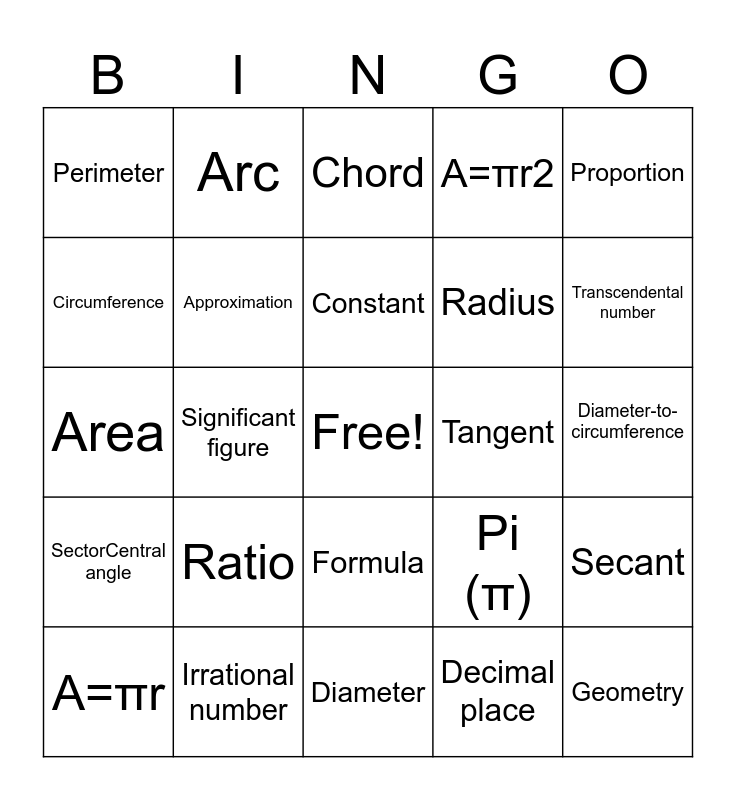 This bingo card has a free space and 27 words: Pi (π), Circle, Radius, Diameter, Circumference, Chord, Arc, SectorCentral angle, Tangent, Secant, Area, A=πr2, A=πr, Irrational number, Transcendental number, Infinite decimal, Approximation, Constant, Ratio, Perimeter, Diameter-to-circumference , Decimal place, Significant figure, Geometry, Formula, Proportion and PI Day.