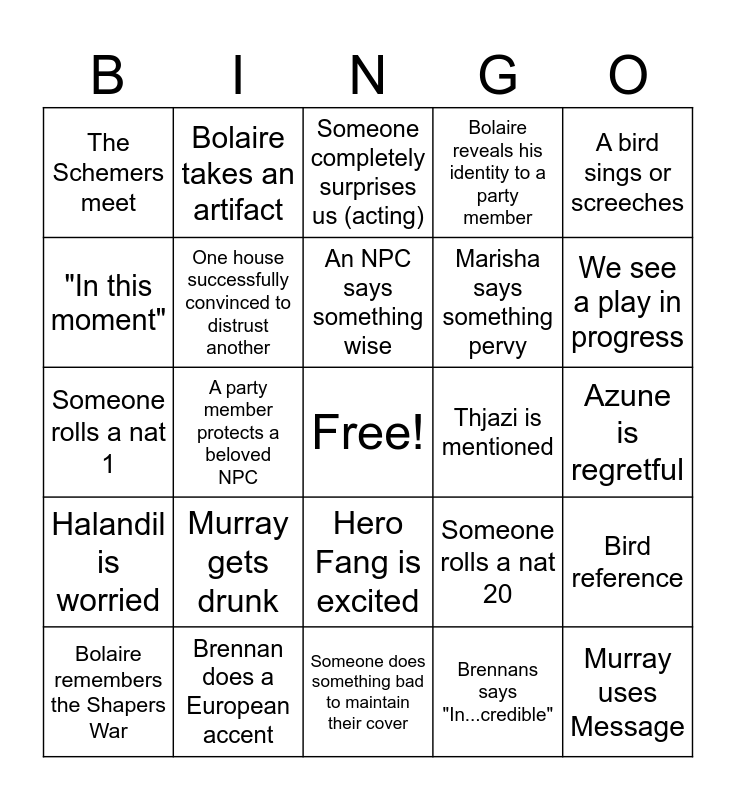 This bingo card has a free space and 24 words: Murray gets drunk, Brennan does a European accent, An NPC says something wise, Bolaire remembers the Shapers War, A bird sings or screeches, The Schemers meet, "In this moment", Bolaire takes an artifact, Thjazi is mentioned, Hero Fang is excited, Marisha says something pervy, Someone rolls a nat 1, Someone rolls a nat 20, Bird reference, One house successfully convinced to distrust another, Brennans says "In...credible", Azune is regretful, Someone completely surprises us (acting), We see a play in progress, A party member protects a beloved NPC, Murray uses Message, Halandil is worried, Bolaire reveals his identity to a party member and Someone does something bad to maintain their cover.