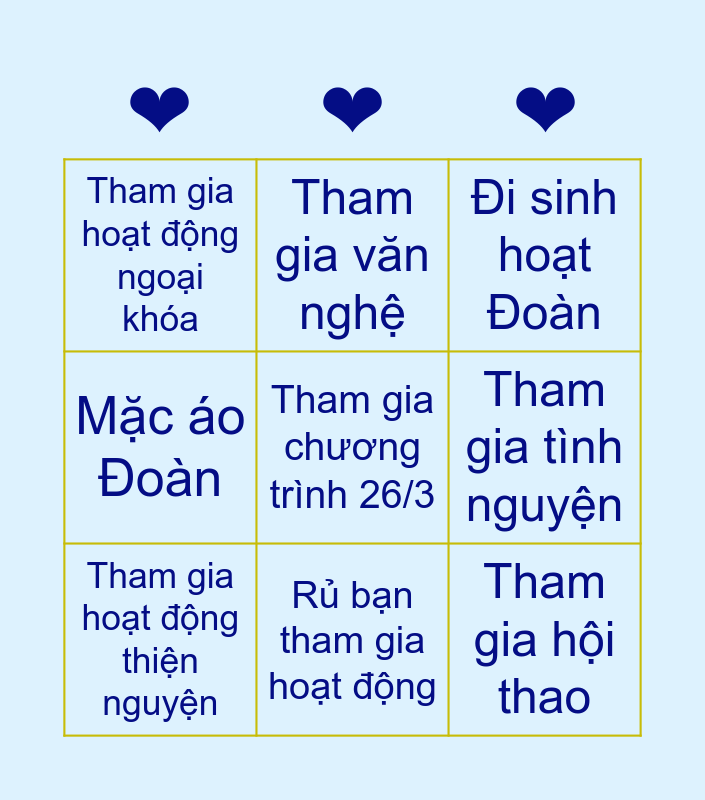 This bingo card has a free space and 8 words: Tham gia tình nguyện, Đi sinh hoạt Đoàn, Tham gia văn nghệ, Tham gia hoạt động thiện nguyện, Tham gia hoạt động ngoại khóa, Tham gia hội thao, Mặc áo Đoàn and Rủ bạn tham gia hoạt động.