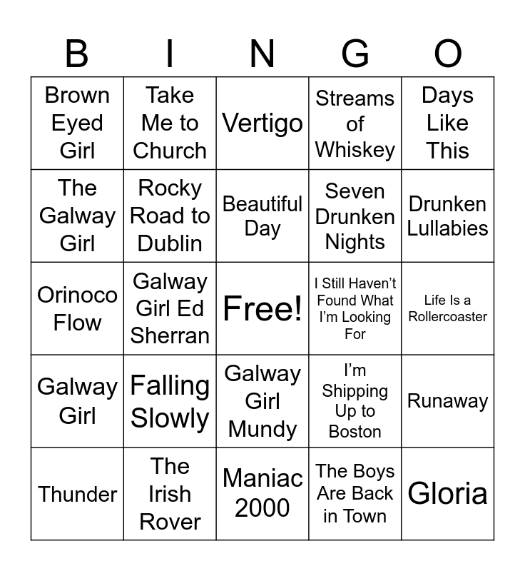 This bingo card has a free space and 62 words: Whiskey in the Jar, The Irish Rover, Wild Rover, Galway Girl, Tell Me Ma, Molly Malone, Rocky Road to Dublin, Finnegan’s Wake, Seven Drunken Nights, Dirty Old Town, Streams of Whiskey, Sally MacLennane, The Galway Girl, Drunken Sailor, The Unicorn, Brown Eyed Girl, Gloria, Days Like This, With or Without You, Beautiful Day, I Still Haven’t Found What I’m Looking For, Vertigo, Thunder, The Boys Are Back in Town, Dancing in the Moonlight, Dreams, Linger, Zombie, Runaway, Believer, So Young, Dreams, C’est La Vie, Rollercoaster, Life Is a Rollercoaster, Take Me to Church, Someone New, Jackie and Wilson, Galway Girl Ed Sherran, Nothing Compares 2 U, Orinoco Flow, Only Time, Falling Slowly, If I Ever Leave This World Alive, Drunken Lullabies, I’m Shipping Up to Boston, Rose Tattoo, The State of Massachusetts, Shivers, Salty Dog, Galway Girl Mundy, Maniac 2000, Put ’Em Under Pressure, This Is the Life, Camera, The Leaving of Liverpool, Step It Out Mary, Whiskey in the Jar (Rock Version), The Black Velvet Band, The Fields of Athenry, Celtic Symphony and Come Out Ye Black and Tans.