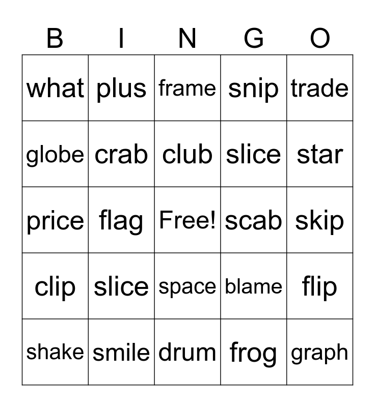 This bingo card has a free space and 29 words: shake, plane, flag, brat, what, frame, crab, slice, scab, smile, skip, graph, drum, frog, star, trash, space, clip, trade, price, blame, snap, slice, globe, snip, plus, flip, club and skip.