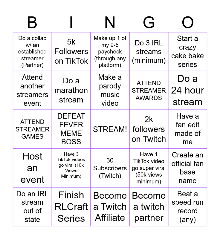 This bingo card has a free space and 24 words: Have 3 TikTok videos go viral (10k Views Minimum), Finish RLCraft Series, Make a parody music video, Do an IRL stream out of state, Start a crazy cake bake series, Do a collab w/ an established streamer (Partner), Attend another streamers event, 5k Followers on TikTok, 2k followers on Twitch, 30 Subscribers (Twitch), ATTEND STREAMER AWARDS, ATTEND STREAMER GAMES, Have 1 TikTok video go super viral (50k views minimum), Create an official fan base name, Do a marathon stream, Become a twitch partner, Have a fan edit made of me, Make up 1 of my 9-5 paycheck (through any platform), Do a 24 hour stream, DEFEAT FEVER MEME BOSS, Beat a speed run record (any), Host an event, Do 3 IRL streams (minimum) and Become a Twitch Affiliate.