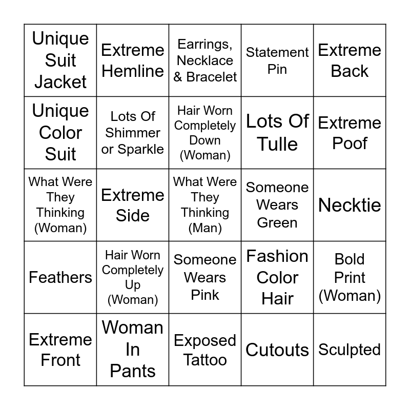 This bingo card has a free space and 24 words: Hair Worn Completely Up (Woman), Woman In Pants, Hair Worn Completely Down (Woman), Extreme Front, Extreme Back, Unique Suit Jacket, Unique Color Suit, Extreme Hemline, Someone Wears Green, Someone Wears Pink, Lots Of Tulle, What Were They Thinking (Woman), Fashion Color Hair, Bold Print (Woman), Lots Of Shimmer or Sparkle, Cutouts, Necktie, Earrings, Necklace & Bracelet, Extreme Poof, Extreme Side, Sculpted, Feathers, Statement Pin and Exposed Tattoo.