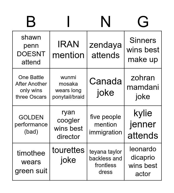 This bingo card has 16 words: tourettes joke, kylie jenner attends, zendaya attends, shawn penn DOESNT attend, GOLDEN performance (bad), IRAN mention, five people mention immigration, teyana taylor backless and frontless dress, One Battle After Another only wins three Oscars, wunmi mosaka wears long ponytail/braid, timothee wears green suit, Sinners wins best make up, ryan coogler wins best director, zohran mamdani joke, Canada joke and leonardo dicaprio wins best actor.