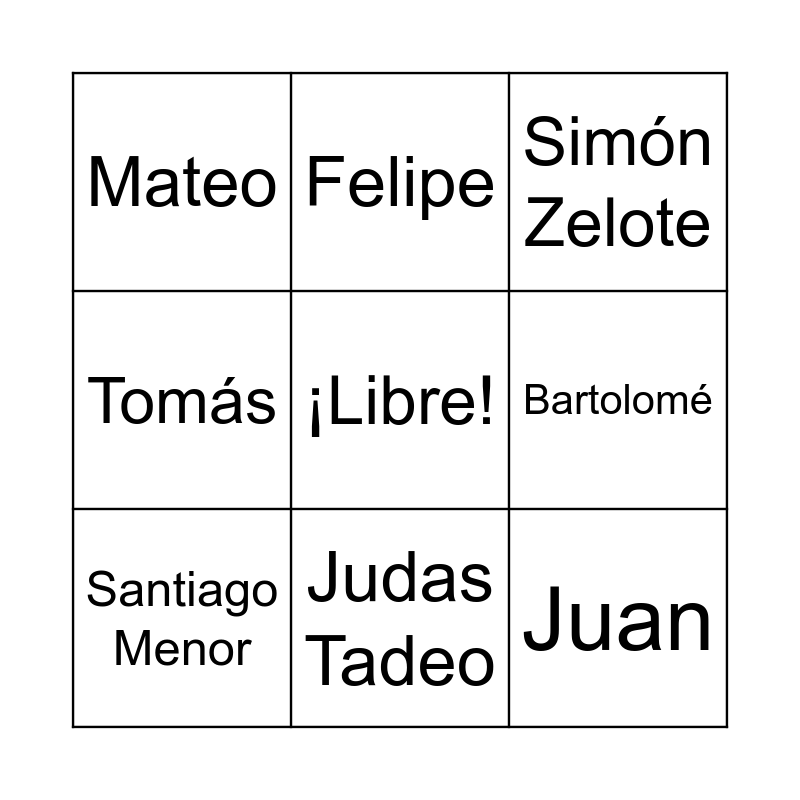 This bingo card has a free space and 12 words: Pedro, Santiago Mayor, Juan, Bartolomé, Felipe, Simón Zelote, Judas Tadeo, Judas Iscariote, Mateo, Tomás, Santiago Menor and Andrés.
