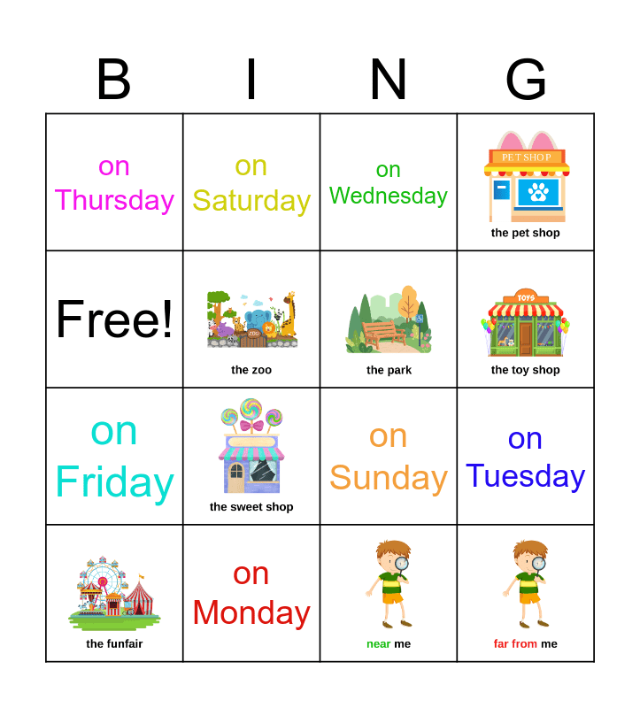 This bingo card has 8 images and 8 words: on Monday, on Tuesday, on Wednesday, on Thursday, on Friday, on Saturday, on Sunday and Free!.