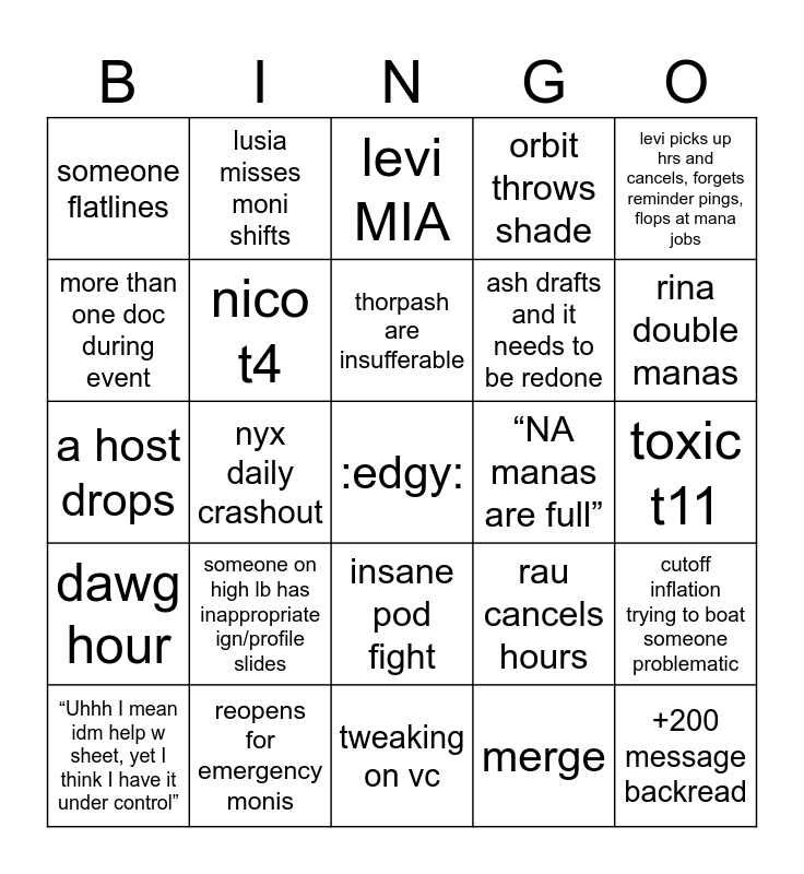 This bingo card has a free space and 24 words: “Uhhh I mean idm help w sheet, yet I think I have it under control”, someone on high lb has inappropriate ign/profile slides, thorpash are insufferable, merge, levi picks up hrs and cancels, forgets reminder pings, flops at mana jobs, someone flatlines, lusia misses moni shifts, levi MIA, “NA manas are full”, toxic t11, a host drops, nico t4, rau cancels hours, cutoff inflation trying to boat someone problematic, more than one doc during event, reopens for emergency monis, tweaking on vc, orbit throws shade, rina double manas, dawg hour, nyx daily crashout, insane pod fight, ash drafts and it needs to be redone and +200 message backread.