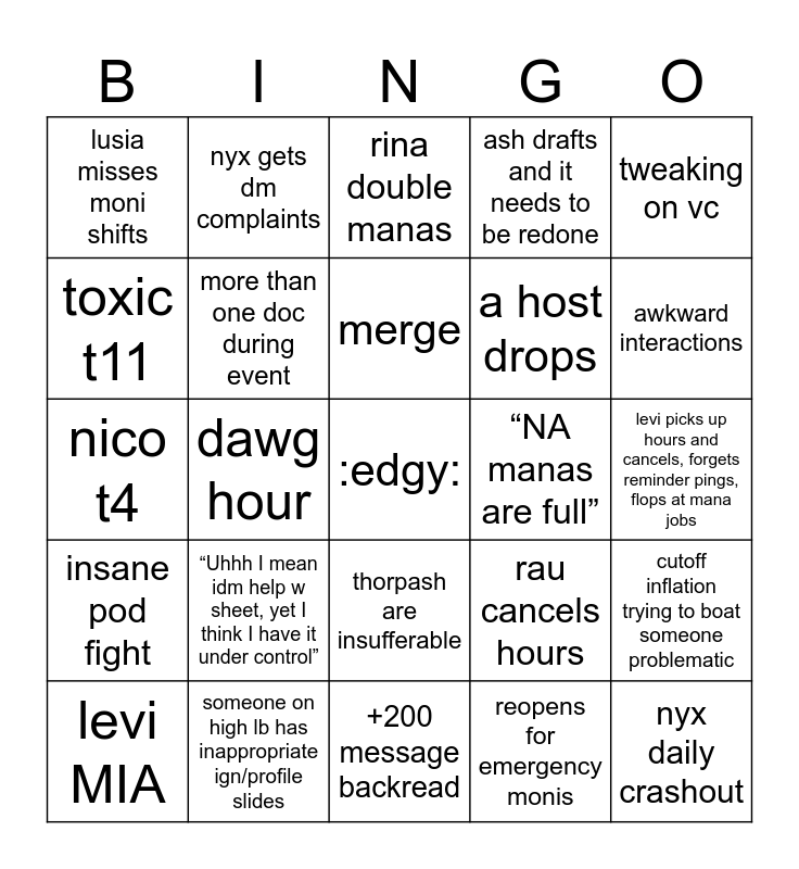 This bingo card has a free space and 24 words: “Uhhh I mean idm help w sheet, yet I think I have it under control”, someone on high lb has inappropriate ign/profile slides, merge, levi MIA, tweaking on vc, lusia misses moni shifts, toxic t11, nyx gets dm complaints, “NA manas are full”, thorpash are insufferable, a host drops, nico t4, rau cancels hours, cutoff inflation trying to boat someone problematic, more than one doc during event, reopens for emergency monis, levi picks up hours and cancels, forgets reminder pings, flops at mana jobs, rina double manas, awkward interactions, dawg hour, nyx daily crashout, insane pod fight, ash drafts and it needs to be redone and +200 message backread.