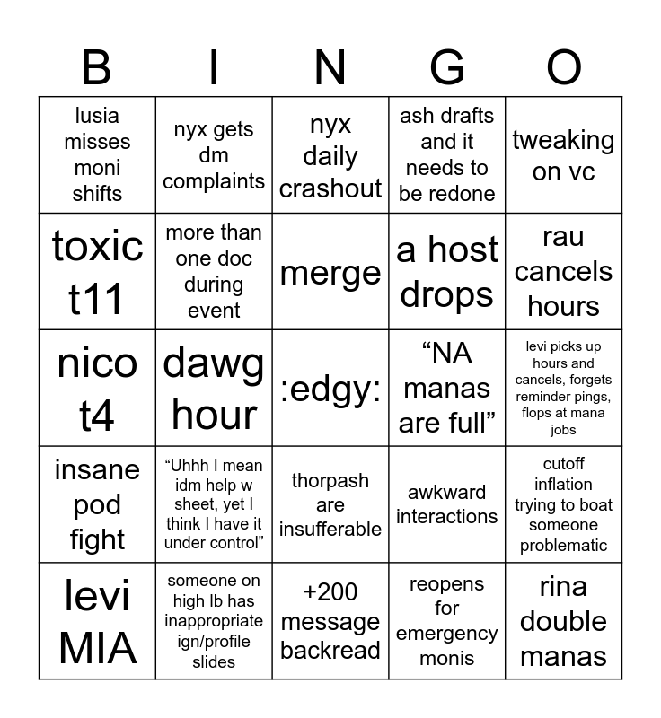 This bingo card has a free space and 24 words: “Uhhh I mean idm help w sheet, yet I think I have it under control”, someone on high lb has inappropriate ign/profile slides, merge, levi MIA, tweaking on vc, lusia misses moni shifts, toxic t11, nyx gets dm complaints, “NA manas are full”, thorpash are insufferable, a host drops, nico t4, awkward interactions, cutoff inflation trying to boat someone problematic, more than one doc during event, reopens for emergency monis, levi picks up hours and cancels, forgets reminder pings, flops at mana jobs, nyx daily crashout, rau cancels hours, dawg hour, rina double manas, insane pod fight, ash drafts and it needs to be redone and +200 message backread.