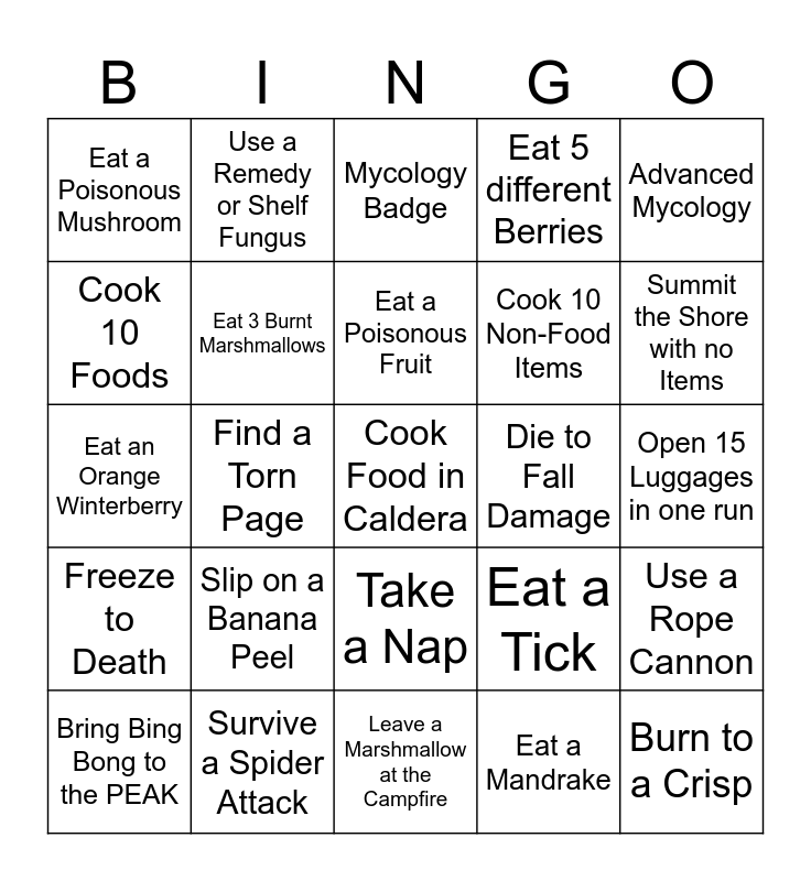 This bingo card has 43 words: Reach the PEAK, Cook Food in Caldera, Incinerate Bing Bong, Bring Bing Bong to the PEAK, Stare into the Sun (Binoculars in Mesa), Eat a Mandrake, Mycology Badge, Serenade the Capybara, Advanced Mycology, Survive a Spider Attack, Eat 5 different Berries, Die to Fall Damage, Take a Nap, Slip on a Banana Peel, Slip on a Jellyfish, Leave a Marshmallow at the Campfire, Break an Alpine Piton, Eat an Orange Winterberry, Eat a Yellow Winterberry, Summit the Shore with no Items, Use a Remedy or Shelf Fungus, Pop a Spore, Obtain a Mystical Item, Eat a Poisonous Mushroom, Land a Backflip, Open 15 Luggages in one run, Cook and Eat a Coconut, Get burned by a Campfire, Eat a Tick, Freeze to Death, Use a Chain Launcher, Use a Rope Cannon, Use a Rescue Claw, Find a Torn Page, Use an AntiRope Cannon, Die to Poison, Burn to a Crisp, Eat a Poisonous Fruit, Cook 10 Foods, Cook 10 Non-Food Items, Use a Magic Bean, Eat 3 Burnt Marshmallows and Use a First-Aid Kit.