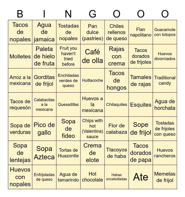 This bingo card has 49 words: Tacos dorados de papa, Tacos dorados de frijoles, Habas encebolladas, Calabacitas a la mexicana, Enchiladas verdes de queso, Agua de horchata, Agua de jamaica, Agua de tamarindo, Flan napolitano, Chips with hot (Valentina) sauce, Guacamole con totopos, Pan dulce (pastries), Tamales de rajas, Tacos de hongos, Sopa Azteca, Esquites, Molletes, Huevos divorciados, Huevos rancheros, Chiles rellenos de queso, Rajas con crema, Quesadillas, Tacos de nopales, Paleta de hielo de fruta, Huevos con nopales, Fruit you haven't tried before, Traditional candy, Enfrijoladas de queso, Huitlacoche, Gorditas de frijol, Memelas de frijol, Chilaquiles, Sopa de lentejas, Tortas de Huazontle, Tacos de requesón, Flor de calabaza, Sope de frijol, Tostadas de frijoles con queso, Arroz a la mexicana, Sopa de fideo, Crema de elote, Sopa de verduras, Huevos a la mexicana, Hot chocolate, Café de olla, Tostadas de nopales, Tlacoyos de haba, Pico de gallo and Ate.