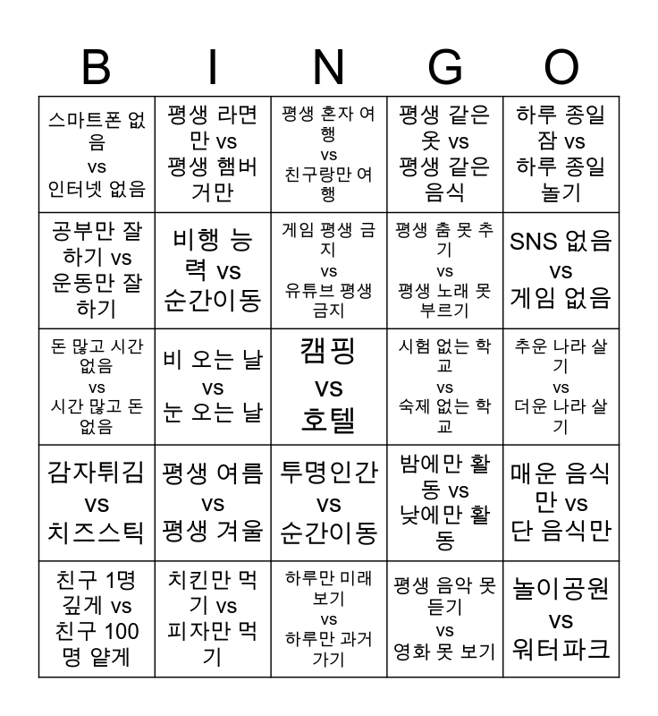 This bingo card has a free space and 24 words: 평생 여름 vs 평생 겨울, 치킨만 먹기 vs 피자만 먹기, 게임 평생 금지 vs 유튜브 평생 금지, 친구 1명 깊게 vs 친구 100명 얕게, 하루 종일 잠 vs 하루 종일 놀기, 스마트폰 없음 vs 인터넷 없음, 공부만 잘하기 vs 운동만 잘하기, 평생 라면만 vs 평생 햄버거만, 시험 없는 학교 vs 숙제 없는 학교, 투명인간 vs 순간이동, 평생 춤 못 추기 vs 평생 노래 못 부르기, 돈 많고 시간 없음 vs 시간 많고 돈 없음, 밤에만 활동 vs 낮에만 활동, 매운 음식만 vs 단 음식만, 비행 능력 vs 순간이동, 평생 음악 못 듣기 vs 영화 못 보기, 추운 나라 살기 vs 더운 나라 살기, 평생 혼자 여행 vs 친구랑만 여행, SNS 없음 vs 게임 없음, 비 오는 날 vs 눈 오는 날, 놀이공원 vs 워터파크, 감자튀김 vs 치즈스틱, 평생 같은 옷 vs 평생 같은 음식 and 하루만 미래 보기 vs 하루만 과거 가기.
