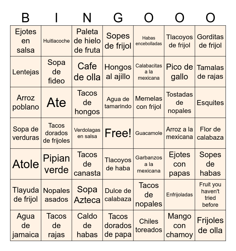 This bingo card has a free space and 48 words: Tacos de nopales, Pico de gallo, Tacos dorados de papa, Tacos dorados de frijoles, Tacos de hongos, Flor de calabaza, Huitlacoche, Tacos de rajas, Tlacoyos de frijol, Tlacoyos de haba, Gorditas de frijol, Sopes de frijol, Tostadas de nopales, Memelas con frijol, Tlayuda de frijol, Arroz a la mexicana, Lentejas, Tamalas de rajas, Enfrijoladas, Habas encebolladas, Calabacitas a la mexicana, Verdolagas en salsa, Ejotes en salsa, Sopa de fideo, Fruit you haven't tried before, Cafe de olla, Esquites, Agua de jamaica, Agua de tamarindo, Ate, Mango con chamoy, Guacamole, Sopes de habas, Nopales asados, Sopa de verduras, Garbanzos a la mexicana, Ejotes con papas, Arroz poblano, Tacos de canasta, Sopa Azteca, Atole, Frijoles de olla, Paleta de hielo de fruta, Caldo de habas, Hongos al ajillo, Dulce de calabaza, Pipian verde and Chiles toreados.