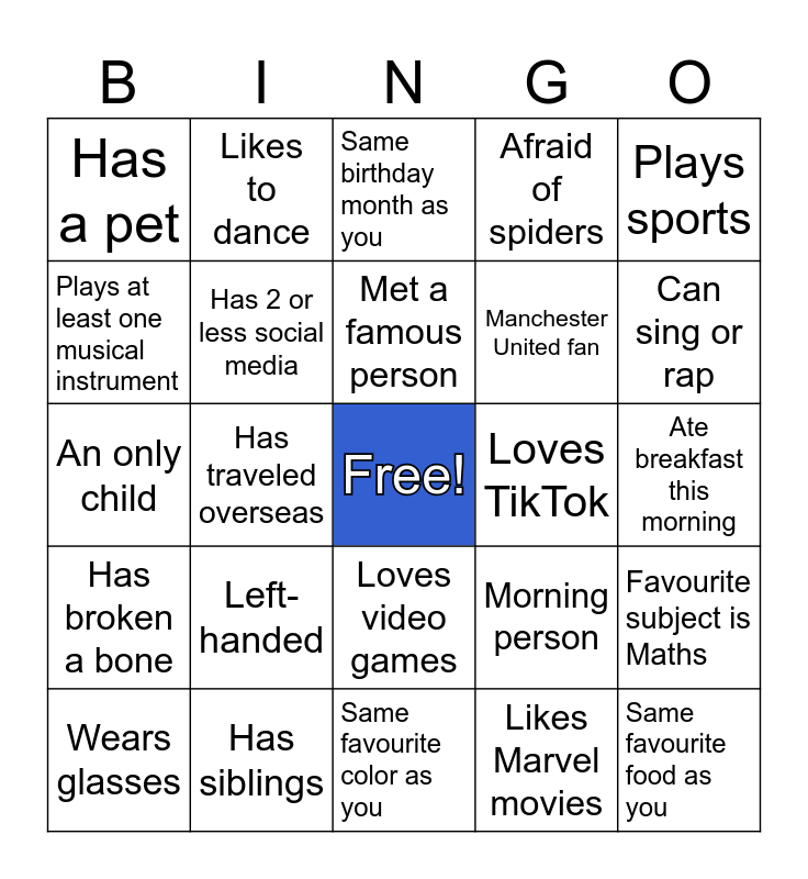 This bingo card has a free space and 24 words: Wears glasses, Left-handed, Met a famous person, Likes Marvel movies, Plays sports, Has a pet, Likes to dance, Same birthday month as you, Loves TikTok, Ate breakfast this morning, An only child, Has 2 or less social media, Morning person, Favourite subject is Maths, Plays at least one musical instrument, Has siblings, Same favourite color as you, Afraid of spiders, Can sing or rap, Has broken a bone, Has traveled overseas, Loves video games, Manchester United fan and Same favourite food as you.