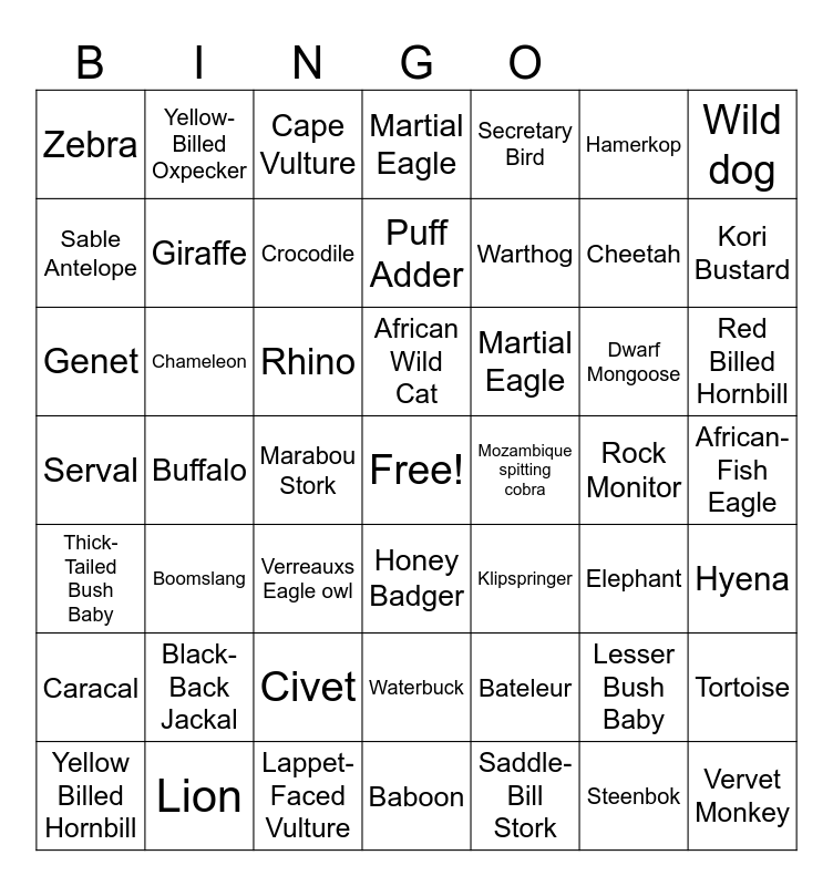 This bingo card has a free space and 52 words: Lion, Cheetah, Leopard, Buffalo, Rhino, Elephant, Yellow-Billed Oxpecker, Steenbok, Hamerkop, Hyena, Wild dog, Honey Badger, Dwarf Mongoose, Martial Eagle, Bateleur, Verreauxs Eagle owl, Sable Antelope, Kori Bustard, Lappet-Faced Vulture, Secretary Bird, Warthog, Marabou Stork, Zebra, Giraffe, Baboon, Vervet Monkey, African-Fish Eagle, Saddle-Bill Stork, Crocodile, Rock Monitor, Black-Bellied Bustard, Martial Eagle, Waterbuck, Lesser Bush Baby, Thick-Tailed Bush Baby, Cape Vulture, Serval, Klipspringer, Caracal, Black-Back Jackal, Civet, Genet, Chameleon, Nyala, African Wild Cat, Mozambique spitting cobra, Boomslang, Puff Adder, Tortoise, Yellow Billed Hornbill, Red Billed Hornbill and Dung Beetle.
