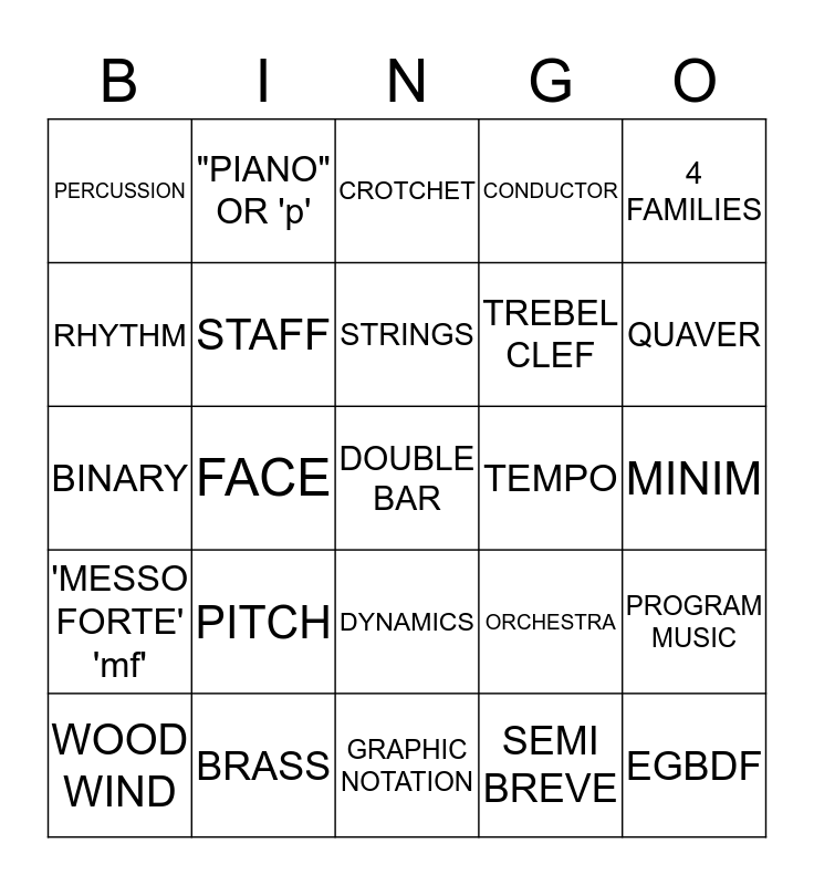 This bingo card has a free space and 24 words: PITCH, BRASS, STRINGS, WOOD WIND, 4 FAMILIES, PERCUSSION, RHYTHM, "PIANO" OR 'p', TEMPO, DYNAMICS, TREBEL CLEF, BINARY, ORCHESTRA, PROGRAM MUSIC, STAFF, SEMI BREVE, MINIM, CROTCHET, QUAVER, FACE, EGBDF, 'MESSO FORTE' 'mf', CONDUCTOR and GRAPHIC NOTATION.
