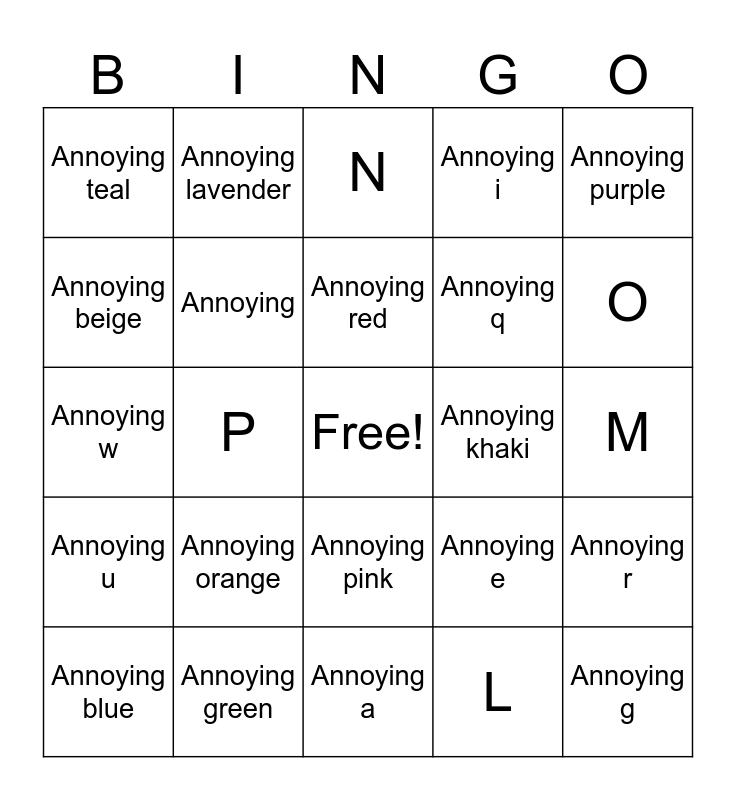 This bingo card has a free space and 24 words: Annoying orange, Annoying green, Annoying red, Annoying blue, Annoying purple, Annoying teal, Annoying beige, Annoying lavender, Annoying khaki, Annoying pink, Annoying q, Annoying w, Annoying e, Annoying r, Annoying, L, M, N, O, P, Annoying g, Annoying u, Annoying i and Annoying a.